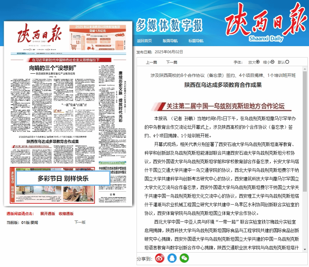 西北大學中國—中亞人類與環(huán)境“一帶一路”聯(lián)合實驗室鐵爾梅茲分實驗室啟用揭牌,陜西科技大學與烏茲別克斯坦國際食品與工程學院共建的國際食品創(chuàng)新研究中心揭牌,西安外國語大學與烏茲別克斯坦國立大學共建的中國—烏茲別克斯坦語言教育與數(shù)字創(chuàng)新合作中心揭牌,陜西交通職業(yè)技術(shù)學院與烏茲別克斯坦塔什干國立技術(shù)大學、陜重汽進出口公司聯(lián)合設立的中烏“秦嶺工坊”揭牌。西北大學中國—中亞人類與環(huán)境“一帶一路”聯(lián)合實驗室撒馬爾罕分實驗室科技考古培訓班開班。
