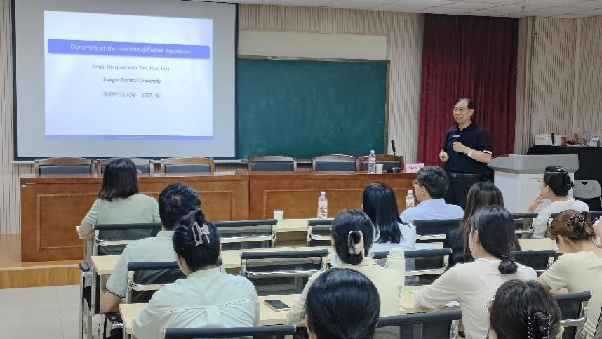 6月13日,江蘇師范大學(xué)校長(zhǎng)杜增吉應(yīng)邀做客陜西科技大學(xué)“前沿科學(xué)報(bào)告”,并作題為《Dynamics of the reaction-diffusion models in advective environments》的學(xué)術(shù)報(bào)告?;顒?dòng)期間,校長(zhǎng)黃劍鋒會(huì)見(jiàn)杜增吉,雙方圍繞學(xué)科建設(shè)協(xié)同創(chuàng)新、高層次人才聯(lián)合培養(yǎng)以及深化校際科研合作等議題進(jìn)行深入交流。數(shù)學(xué)與數(shù)據(jù)科學(xué)學(xué)院黨委書記郭改慧主持報(bào)告會(huì)。