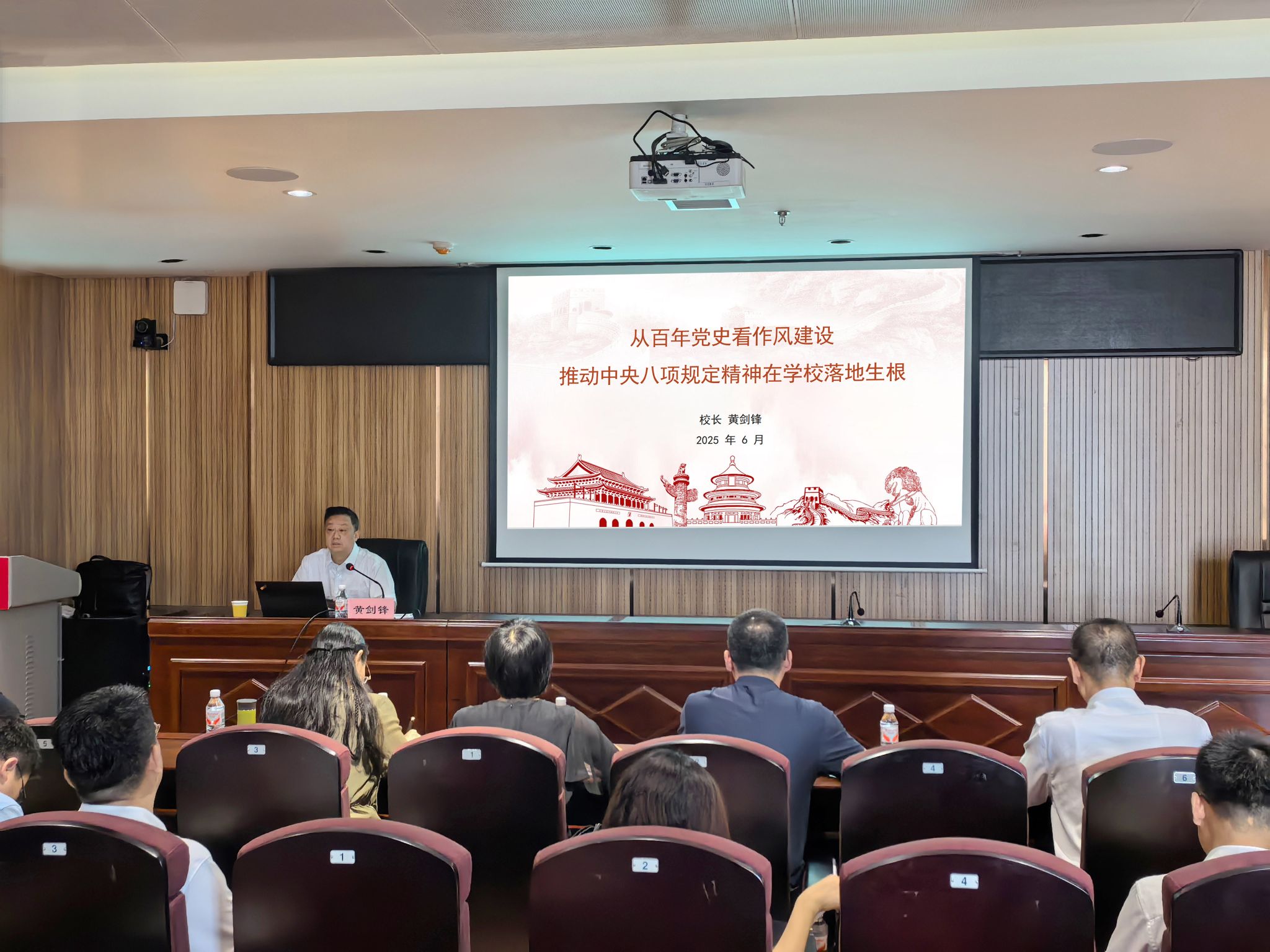 6月20日,黨委副書記、校長(zhǎng)黃劍鋒以《從百年黨史看作風(fēng)建設(shè),推動(dòng)中央八項(xiàng)規(guī)定精神在學(xué)校落地生根》為題,為分管(聯(lián)系)單位黨員領(lǐng)導(dǎo)干部和教務(wù)處黨支部黨員講授作風(fēng)建設(shè)專題黨課。