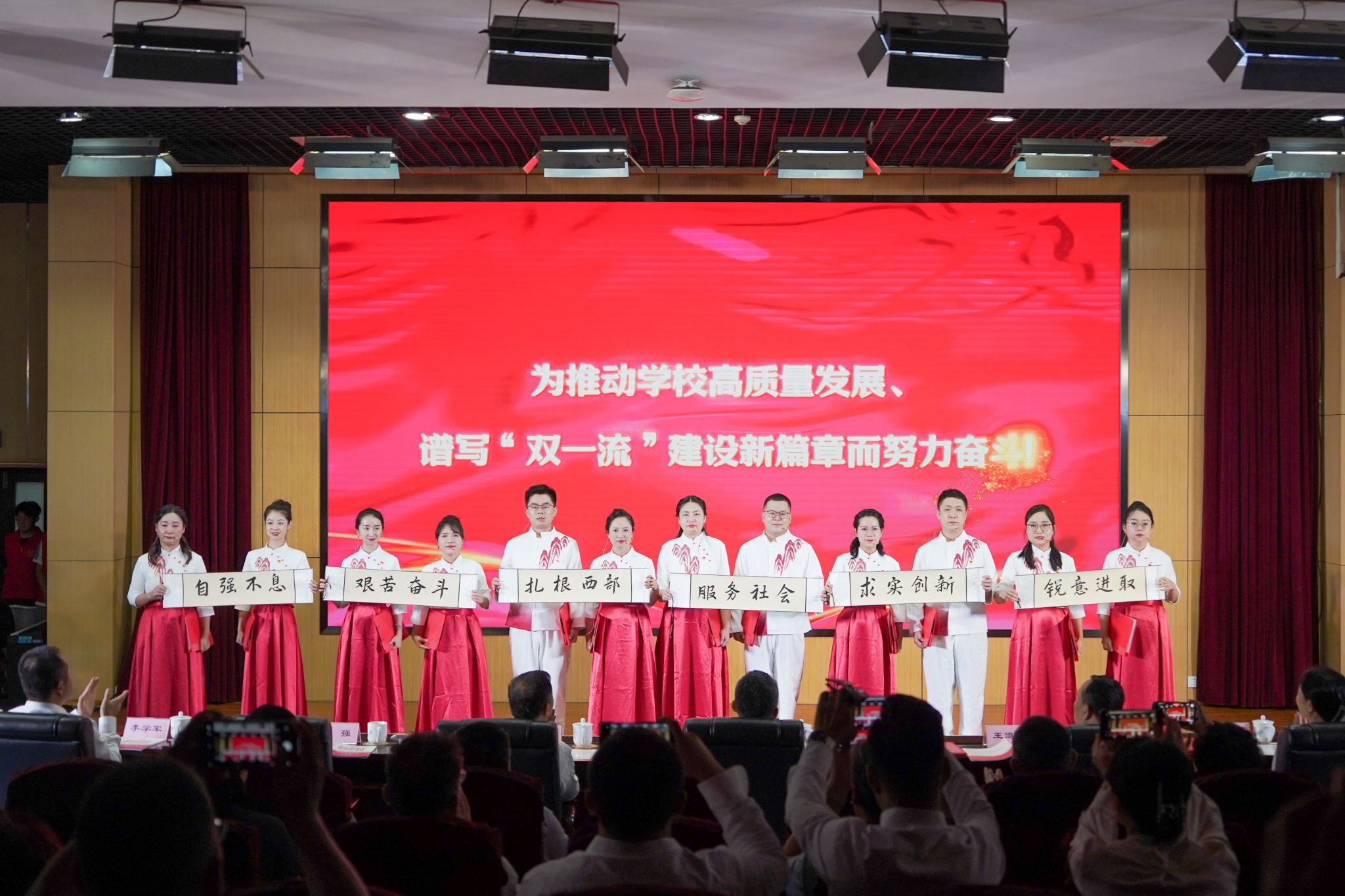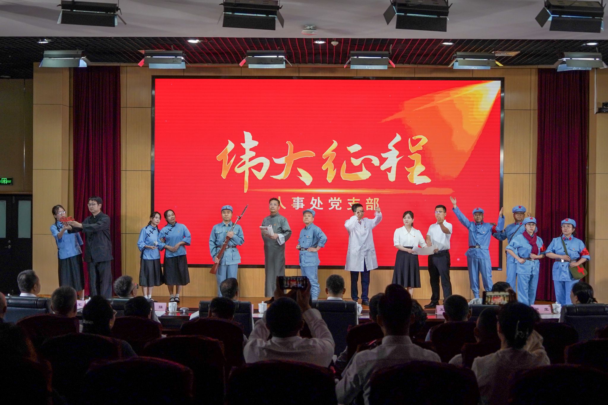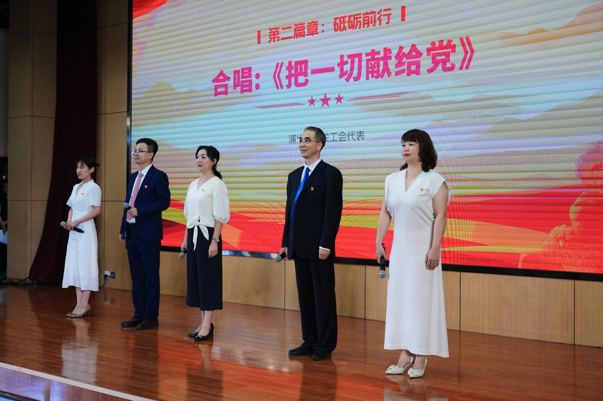 本次展演以“永遠跟黨走 奮進新征程”為主題,分為“初心啟航”“砥礪前行”“時代新章”三個篇章。全體校領導朗誦的原創(chuàng)作品《紅色基因永相傳》,結合學校“三次創(chuàng)業(yè)、兩次搬遷、一次劃轉(zhuǎn)”的奮斗與輝煌,全面回顧了學校紅色基因來源、傳承和發(fā)揚之路,昭示信仰力量代代相承;科技處、前沿院、農(nóng)研院黨支部的《星火燎原》,以鏗鏘之音再現(xiàn)革命火種燎原之勢;研究生院黨支部的《紅船從南湖起航》,引領觀眾回溯夢想起點,感悟紅船精神之源;校友辦、工會、黨辦校辦、組織部黨支部的《可愛的中國》,飽含深情地抒發(fā)了對祖國母親的無限摯愛;教務處黨支部的《七月頌》,以激昂詩行回溯黨從南湖紅船到復興巨輪的壯闊征程;人事處黨支部的《偉大征程》,生動展現(xiàn)黨帶領人民取得的歷史性成就;宣傳部、博物館、招生辦黨支部的《永遠跟你走》,用層層遞進的誦讀傳遞“黨指向哪里、我們就奔赴哪里”的赤誠信念;國際處、學科辦、發(fā)展規(guī)劃處、實驗室與設備管理處黨支部的《輕工鑄魂映黨心——陜科大“三創(chuàng)兩遷”頌》,講述了陜科大黨員干部在平凡崗位上踐行初心使命的感人故事;紀監(jiān)、審計處黨支部的《三色經(jīng)緯鑄防線》,結合本職工作展現(xiàn)共產(chǎn)黨員的責任擔當;財務處黨支部的《紅船領航百年路,三創(chuàng)兩遷啟新途》,展現(xiàn)了陜科大人扎根西部、服務國家發(fā)展的嶄新篇章;信息中心黨支部的《紅色電波·智慧傳承——從延安到AI時代的信仰之路》,彰顯了紅色通信精神在數(shù)字時代的薪火相傳。此外,機關工會代表還合唱《把一切獻給黨》,大學生藝術團合唱《唱支山歌給黨聽》和表演快板書《黨的輝煌歷程》。