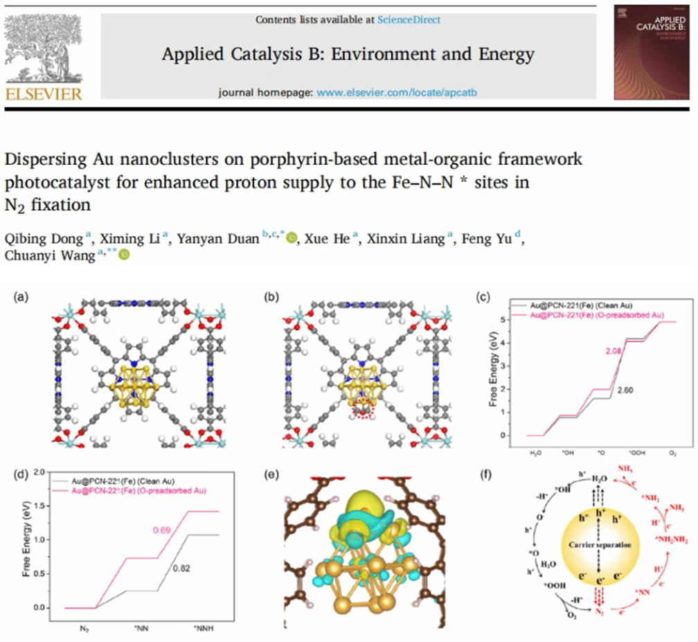 相關(guān)成果以“Dispersing Au nanoclusters on porphyrin-based metal-organic framework photocatalyst for enhanced proton supply to the Fe–N–N*?sites in N2 fixation”為題,發(fā)表在Applied Catalysis B: Environment and Energy(IF = 20.2)上。陜西科技大學為論文第一通訊單位,環(huán)境學院2021級博士研究生董奇兵為該論文的第一作者,環(huán)境學院王傳義教授為論文通訊作者。