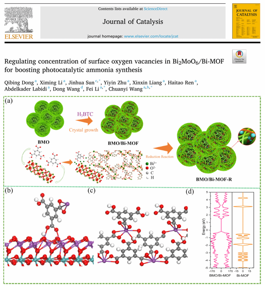 系列成果四:表面氧空位(OVs)工程作為提升光催化性能的有效策略已被廣泛采用。然而,目前能夠精準調(diào)控表面OVs濃度并闡明其對固氮活性影響機制的光催化體系仍較為匱乏。本研究以Bi2MoO6(BMO)為基底,通過在其表面負載鉍基金屬有機框架(Bi-MOF)構(gòu)建可操作平臺,利用Bi-MOF組分中鉍離子的還原特性實現(xiàn)OVs濃度的精準調(diào)控。