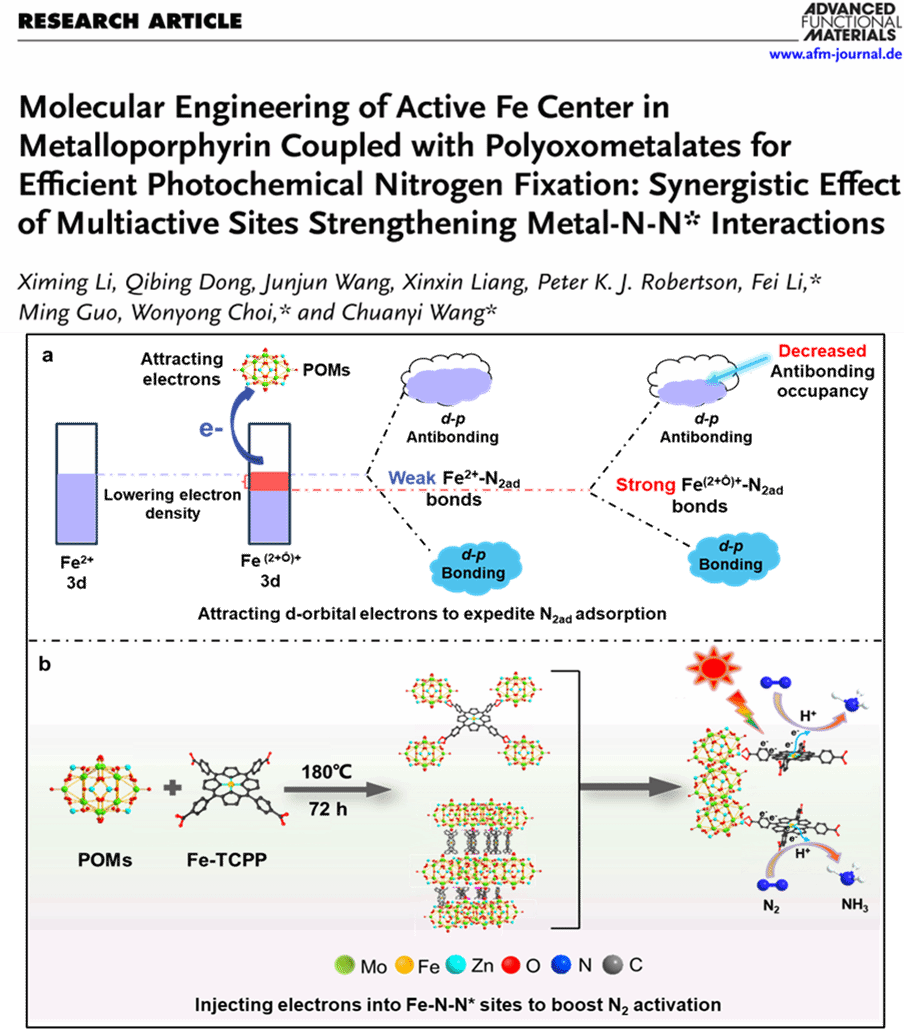 相關(guān)成果以“Molecular engineering of active Fe center in metalloporphyrin coupled with polyoxometalates for efficient photochemical nitrogen fixation: Synergistic effect of multiactive sites strengthening metal-N-N* interactions”為題,發(fā)表在Advanced Functional Materials(IF = 18.5)上。陜西科技大學為論文第一通訊單位,環(huán)境學院2021級博士研究生李喜明為該論文的第一作者,環(huán)境學院王傳義教授為論文通訊作者。