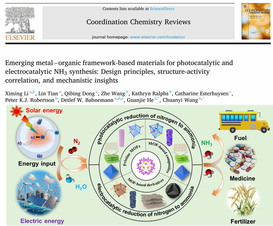 相關(guān)成果以“Emerging metal?organic framework-based materials for photocatalytic and electrocatalytic NH3 synthesis: Design principles, structure-activity correlation, and mechanistic insights”為題,發(fā)表在Coordination Chemistry Reviews(IF = 20.3)上。陜西科技大學為論文第一通訊單位,論文第一作者為環(huán)境學院2021級博士研究生李喜明,環(huán)境學院王傳義教授為論文通訊作者。