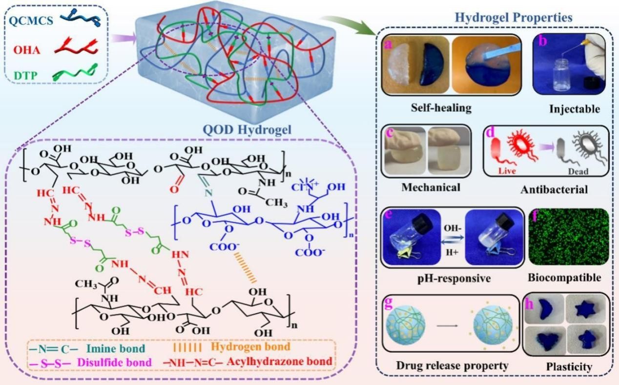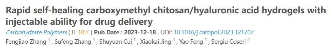 藥物釋放是治療人類各種疾病的有效手段,因此在生物醫(yī)學(xué)領(lǐng)域構(gòu)建合適的藥物釋放載體非常重要。本團(tuán)隊(duì)開發(fā)了一種以季銨化羧甲基殼聚糖(QCMCS)、氧化透明質(zhì)酸(OHA)、3,3′-二硫雙-(丙酰肼)(DTP)為原料合成具有優(yōu)異性能的水凝膠,作為藥物釋放的載體。水凝膠是通過(guò)簡(jiǎn)單的“一鍋法”制備的,無(wú)需外部刺激,基于形成的動(dòng)態(tài)共價(jià)鍵(亞胺鍵、酰腙鍵、二硫鍵)和氫鍵之間的相互作用。水凝膠具有快速自愈特性,30分鐘后自愈率為96%,以及良好的pH反應(yīng)性和出色的細(xì)胞相容性(細(xì)胞存活率高達(dá)98%)。水凝膠的壓應(yīng)力達(dá)到423 kPa。此外,一種代表性藥物 (乙酰水楊酸) 在水凝膠中顯示出持續(xù)釋放(>72 h)。動(dòng)力學(xué)模型顯示藥物釋放行為與Fick擴(kuò)散機(jī)制一致,研究結(jié)果表明QCMCS + OHA + DTP可注射自修復(fù)水凝膠是構(gòu)建pH控制藥物遞送平臺(tái)的潛在材料。相關(guān)研究成果以“Rapid self-healing carboxymethyl chitosan/hyaluronic acid hydrogels with injectable ability for drug delivery”為題發(fā)表在國(guó)際期刊Carbohydrate Polymers(文章鏈接:https://doi.org/10.1016/j.carbpol.2023.121707)