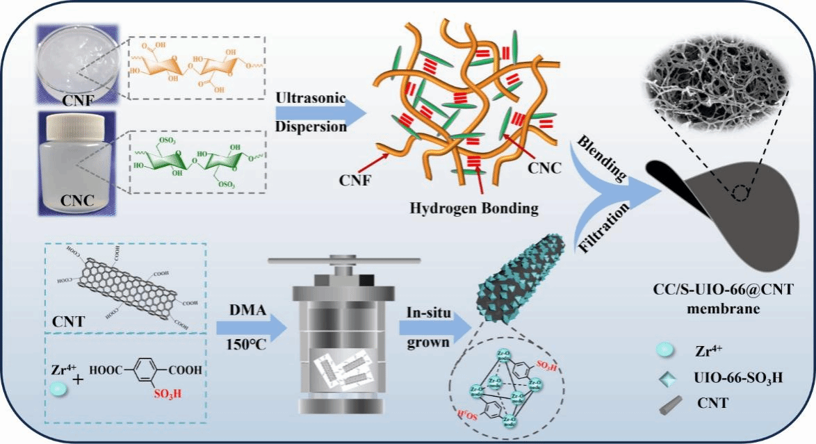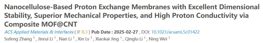 本團(tuán)隊(duì)還通過(guò)納米纖維素復(fù)合MOF@CNT,制備了一種可用于燃料電池的質(zhì)子交換膜,以CNFs 和CNCs的復(fù)合材料為基體,然后在CNT表面原位生長(zhǎng) S-UIO-66,然后將其作為填料添加到基體中。值得注意的是,S-UIO-66在CNT表面的原位生長(zhǎng)不僅促進(jìn)了CNTs 的均勻分散,而且有效地保證了S-UIO-66在 CNF/CNC基體中的分布。此外,CNF/CNC基體的高電負(fù)性進(jìn)一步增強(qiáng)了這種色散效應(yīng)和穩(wěn)定性,而 S-UIO-66@CNT 促進(jìn)了有效的質(zhì)子傳導(dǎo)。此外,S-UIO-66 和CNT出色的機(jī)械強(qiáng)度和化學(xué)穩(wěn)定性顯著提高了CNF/CNC基體的穩(wěn)定性。由于這些協(xié)同優(yōu)勢(shì),CC/S-UIO-66@CNT-5復(fù)合膜的質(zhì)子電導(dǎo)率在80 °C和100% RH下達(dá)到0.105 S/cm,在80 °C和33% RH下達(dá)到27 mS/cm,同時(shí)還表現(xiàn)出令人印象深刻的 93 MPa 機(jī)械強(qiáng)度和顯著的尺寸穩(wěn)定性。相關(guān)研究成果以“Nanocellulose-Based Proton Exchange Membranes with Excellent Dimensional Stability, Superior Mechanical Properties, and High Proton Conductivity via Composite MOF@CNT”為題發(fā)表在國(guó)際期刊ACS Applied Materials & Interfaces(文章鏈接:https://doi.org/10.1021/acsami.5c01422)