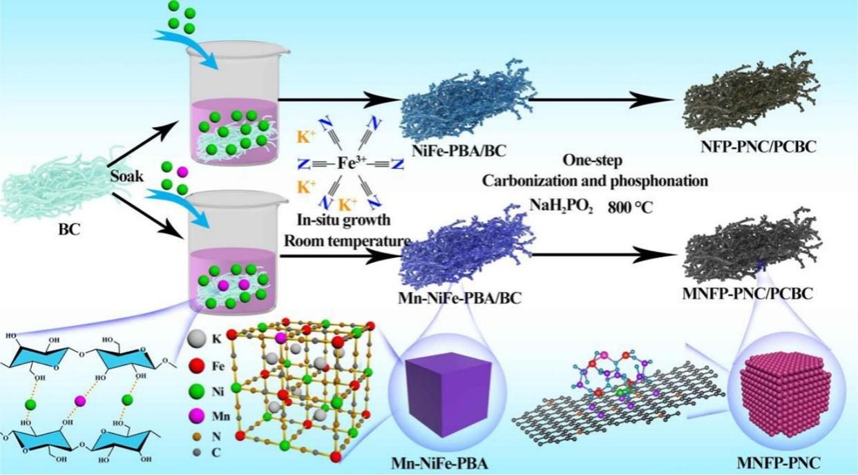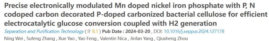 并且,本研究團(tuán)隊(duì)以細(xì)菌纖維素為基材,以Mn摻雜NiFe-PBA為前驅(qū)體,通過(guò)一步碳化-磷酸化方法制備了嵌入P、N共摻雜碳基底并直接在P摻雜CBC(MNFP-PNC/PCBC) 表面生長(zhǎng)的PBA衍生的Mn摻雜磷酸鎳鐵,用于電催化葡萄糖轉(zhuǎn)化與制氫耦,MNFP-PNC/PCBC的精確電子調(diào)制和結(jié)構(gòu)設(shè)計(jì)增強(qiáng)了催化劑的內(nèi)稟活性和暴露活性位點(diǎn)的數(shù)量,并通過(guò)錨定納米活性材料提供了優(yōu)異的導(dǎo)電性和穩(wěn)定性。在葡萄糖存在的情況下,只需1.55 V的低電位即可達(dá)到50 mA cm?2的電流密度。有趣的是,這種耦合系統(tǒng)在陰極有效地生成了氫氣,而陽(yáng)極葡萄糖轉(zhuǎn)化率的增加導(dǎo)致葡萄糖轉(zhuǎn)化率達(dá)到97%,甲酸鹽的產(chǎn)率為79.5%,法拉第效率為86.1%。這項(xiàng)工作為開發(fā)高催化活性生物質(zhì)電催化轉(zhuǎn)化耦合制氫電催化劑開辟了新的前景,通過(guò)結(jié)構(gòu)工程和電子調(diào)制具有廣泛的應(yīng)用可能性。相關(guān)研究成果以“Precise electronically modulated Mn doped nickel iron phosphate with P, N codoped carbon decorated P-doped carbonized bacterial cellulose for efficient electrocatalytic glucose conversion coupled with H2 generation”為題發(fā)表在國(guó)際期刊Separation and Purification Technology(文章鏈接:https://doi.org/10.1016/j.seppur.2024.127178)。