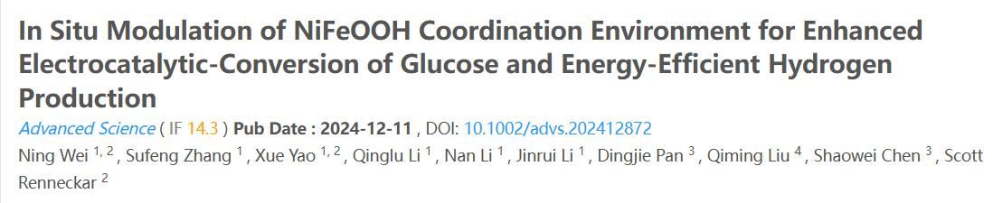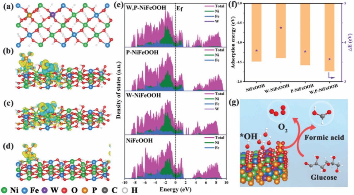 本團(tuán)隊(duì)以NiFe基金屬有機(jī)框架(MOF)為前驅(qū)體,通過(guò)離子交換和磷酸化制備W摻雜磷化鎳鐵(W-NiFeP)納米片陣列,其對(duì)析氫反應(yīng)(HER)表現(xiàn)出高電催化活性,具有僅-179 mV的過(guò)電位,在堿性介質(zhì)中可實(shí)現(xiàn)100 mA cm?2的電流密度,W-NiFeP的電化學(xué)活化促進(jìn)了磷酸基團(tuán)的原位形成,產(chǎn)生W,P-NiFeOOH。這項(xiàng)工作的結(jié)果突出了開發(fā)用于生物質(zhì)電催化轉(zhuǎn)化的有效電催化劑在構(gòu)建用于綠色氫氣生產(chǎn)的高效電解槽中的重要性。相關(guān)研究成果以“In Situ Modulation of NiFeOOH Coordination Environment for Enhanced Electrocatalytic-Conversion of Glucose and Energy-Efficient Hydrogen Production”為題發(fā)表在國(guó)際期刊Advanced Science(文章鏈接:https://doi.org/10.1002/advs.202412872)。