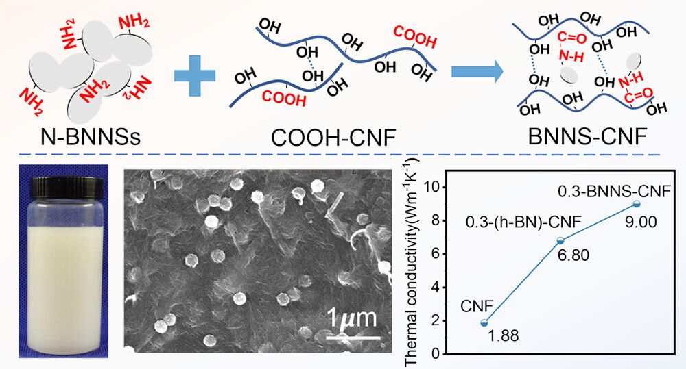 隨著電子器件不斷向高功率和集成化方向發(fā)展,導(dǎo)致對(duì)具有高導(dǎo)熱性和電絕緣性的可再生聚合物復(fù)合材料的需求日益增加,以解決電子器件過(guò)熱的問(wèn)題?;诖?,本團(tuán)隊(duì)對(duì)六方氮化硼進(jìn)行球磨和氨基改性,然后使用羧基化納米纖維素(COOH-CNF)來(lái)分散氮化硼納米片(BNNSs)。在酰胺鍵的幫助下,BNNSs在納米纖維素(CNF)基體中均勻分散;這減少了BNNSs之間的聚集和空隙的存在,促進(jìn)了有效熱通道的構(gòu)建。所得復(fù)合漿料分散穩(wěn)定,可以過(guò)濾成膜;當(dāng)BNNSs的負(fù)載量為30%時(shí),綜合性能最佳,導(dǎo)熱系數(shù)(TC)為9.00 W·m?1·K?1(CNF為1.88 W·m?1·K?1)。此外,體積電阻率達(dá)到9.38×1013 Ω·cm(CNF為2.53×1013 Ω·cm),電強(qiáng)度為22.67 kV·mm(CNF為17.04 kV·mm)。結(jié)果表明,BNNS-CNF復(fù)合薄膜具有高導(dǎo)熱性和優(yōu)異的絕緣性能,因此在電子設(shè)備熱管理方面具有廣闊的應(yīng)用前景。相關(guān)研究成果以“Highly Exfoliated Boron Nitride Nanosheets Via Carboxyl Nanocellulose for Thermally Conductive Nanocomposite Films”為題發(fā)表在國(guó)際期刊ACS Applied Nano Materials(文章鏈接:https://doi.org/10.1021/acsanm.3c05310)
