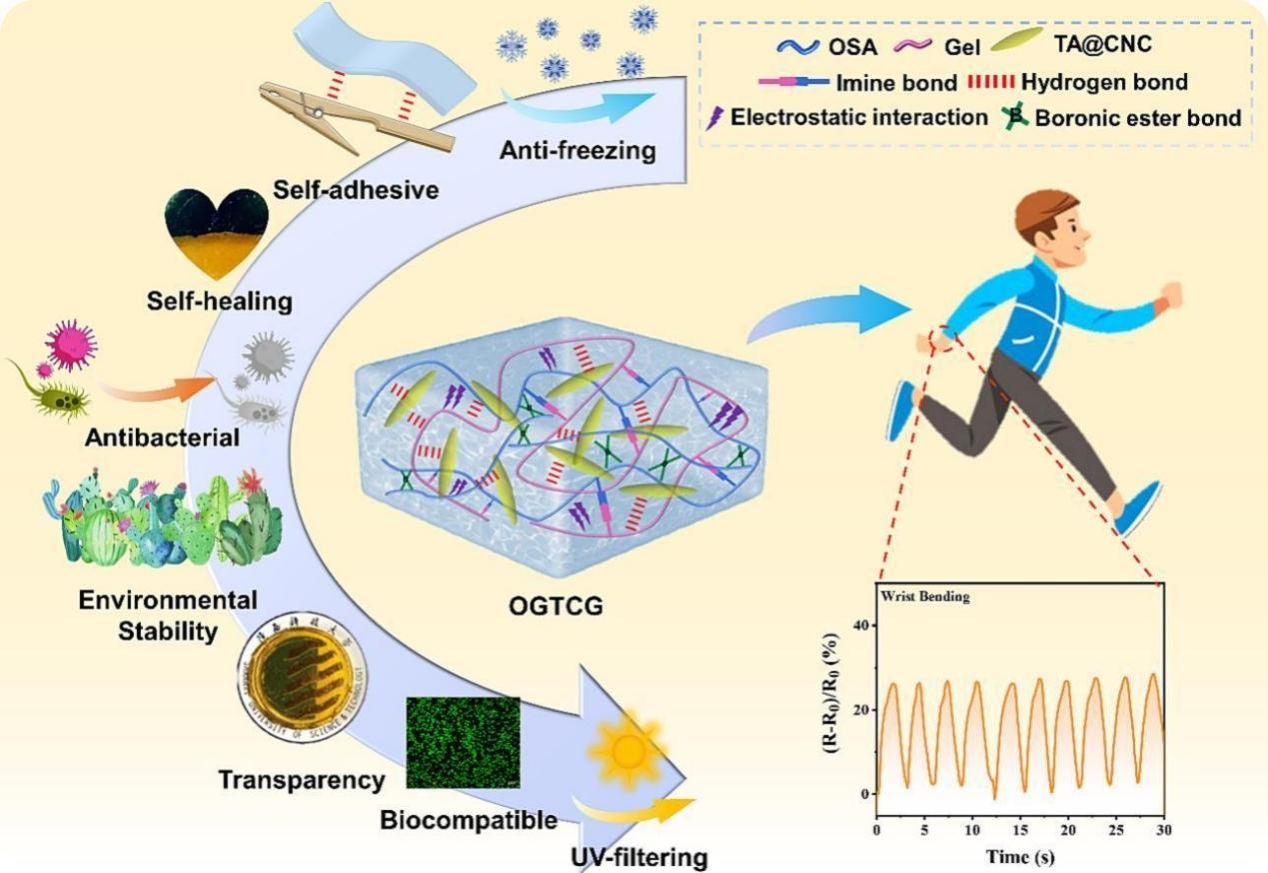 本團(tuán)隊(duì)受貽貝和壁虎啟發(fā)的仿生學(xué),通過(guò)水/甘油系統(tǒng)和硼砂的簡(jiǎn)單一步法設(shè)計(jì)和構(gòu)建了具有自粘、自修復(fù)、透明、紫外線過(guò)濾、抗霜凍、環(huán)境穩(wěn)定、抗菌和生物相容性特性的全生物質(zhì)基水凝膠(OGTCG)使用協(xié)同動(dòng)態(tài)共價(jià)和非共價(jià)化學(xué)方法在沒(méi)有任何交聯(lián)劑的情況下添加。OGTCG水凝膠的透明度達(dá)到 81.06 %,而添加的單寧酸包覆的纖維素納米晶(TA@CNC)誘導(dǎo)了紫外線阻擋效果。OGTCG水凝膠表現(xiàn)出高韌性(218.67 kPa)和模量 (100.32 kPa),TA@CNC 增強(qiáng)。OGTCG水凝膠表現(xiàn)出良好的自愈能力,6小時(shí)后效率超過(guò) 90%。在二元溶劑體系中,OGTCG水凝膠具有環(huán)境穩(wěn)定性,如密度泛函理論(DFT)所示,大大拓寬了其應(yīng)用范圍。此外,它的導(dǎo)電率為2.3 mS cm?1靈敏度為3.97。因此,OGTCG水凝膠憑借其快速響應(yīng)和實(shí)時(shí)監(jiān)測(cè)能力,在監(jiān)測(cè)人類健康方面顯示出巨大的應(yīng)用潛力。相關(guān)研究成果以“Tannic acid-coated cellulose nanocrystal-reinforced transparent multifunctional hydrogels with UV-filtering for wearable flexible sensors”為題發(fā)表在國(guó)際期刊Carbohydrate Polymers(文章鏈接:https://doi.org/10.1016/j.carbpol.2023.121385)