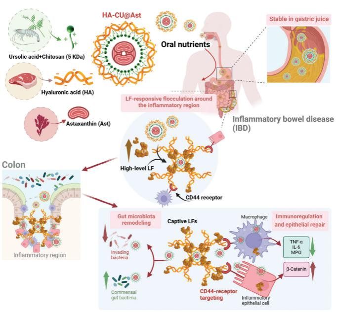 炎癥性腸?。↖BD)是一種慢性腸道炎癥疾病,傳統(tǒng)口服藥物常因腸道黏膜損傷和腹瀉導(dǎo)致藥物無(wú)法有效滯留于炎癥區(qū)域,嚴(yán)重限制療效。盡管納米遞送系統(tǒng)可改善藥物溶解度,但非特異性釋放和過(guò)早泄露問(wèn)題仍亟待解決。針對(duì)這一問(wèn)題,楊金帆副教授合作者提出一種基于天然營(yíng)養(yǎng)素蝦青素,殼寡糖和透明質(zhì)酸的口服精準(zhǔn)納米遞送系統(tǒng)(HA-CU@Ast)。通過(guò)智能識(shí)別炎癥區(qū)域乳鐵蛋白高表達(dá)特征觸發(fā)納米顆粒絮凝,結(jié)合透明質(zhì)酸靶向病灶高表達(dá)CD44受體的雙重機(jī)制,實(shí)現(xiàn)蝦青素在腸道炎癥部位的精準(zhǔn)錨定,顯著提升蝦青素的溶解度(513倍)及抗氧化活性。動(dòng)物實(shí)驗(yàn)顯示,治療組IBD小鼠存活率達(dá)100%,結(jié)腸長(zhǎng)度恢復(fù)至健康水平,促炎因子(TNF-α、IL-6)降低,腸道菌群有害菌減少且益生菌豐度顯著恢復(fù)。該策略以天然可食用材料構(gòu)建,兼具高效性與安全性,為IBD及其他炎癥疾病的精準(zhǔn)治療開辟新路徑。(文章鏈接:https://pubmed.ncbi.nlm.nih.gov/39722174/DOI: 10.1002/adhm.202402731)