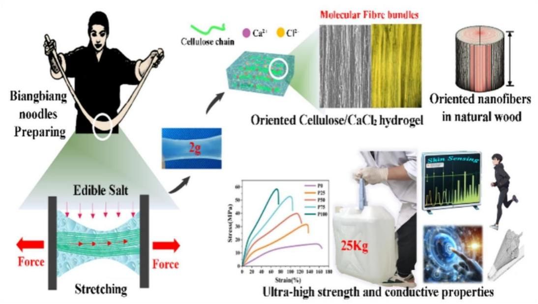本團(tuán)隊(duì)研究了一種通過(guò)定向預(yù)拉伸和溶劑置換結(jié)合制備超強(qiáng)超韌導(dǎo)電水凝膠的策略,成功地模擬了纖維在木材中的定向排列,減少了相鄰區(qū)域之間的平均距離,并大大提高了水凝膠的力學(xué)性能。然后引入金屬離子以形成金屬離子配位鍵,從而實(shí)現(xiàn)各種特性的多功能耦合,包括高拉伸應(yīng)變、保水性、導(dǎo)電性和抗凍性。水凝膠具有優(yōu)異的機(jī)械性能,具有極高的拉伸強(qiáng)度(52.79 ± 0.24 MPa)、楊氏模量(287 ± 20 MPa)、斷裂韌性(34.41 ± 2.89 MJ m?3)、斷裂應(yīng)變(104.6 ± 2 %)和離子電導(dǎo)率(11.73 ± 0.06 mS m?1),在?80 °C下冷凍7天后,力學(xué)性能和電導(dǎo)率保持與冷凍前相同的水平。其出色的多功能性可應(yīng)用于需要高強(qiáng)度且在極端環(huán)境中作的機(jī)器人軟組織(如跟腱)。相關(guān)研究成果以“Ultra-strong and tough cellulose-based conductive hydrogels via orientation inspired by noodles pre-stretching”為題發(fā)表在國(guó)際期刊Carbohydrate Polymers(文章鏈接:https://doi.org/10.1016/j.carbpol.2024.122286)。