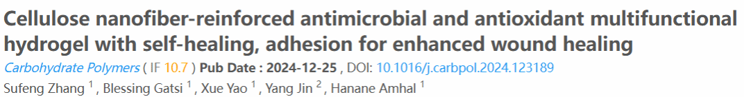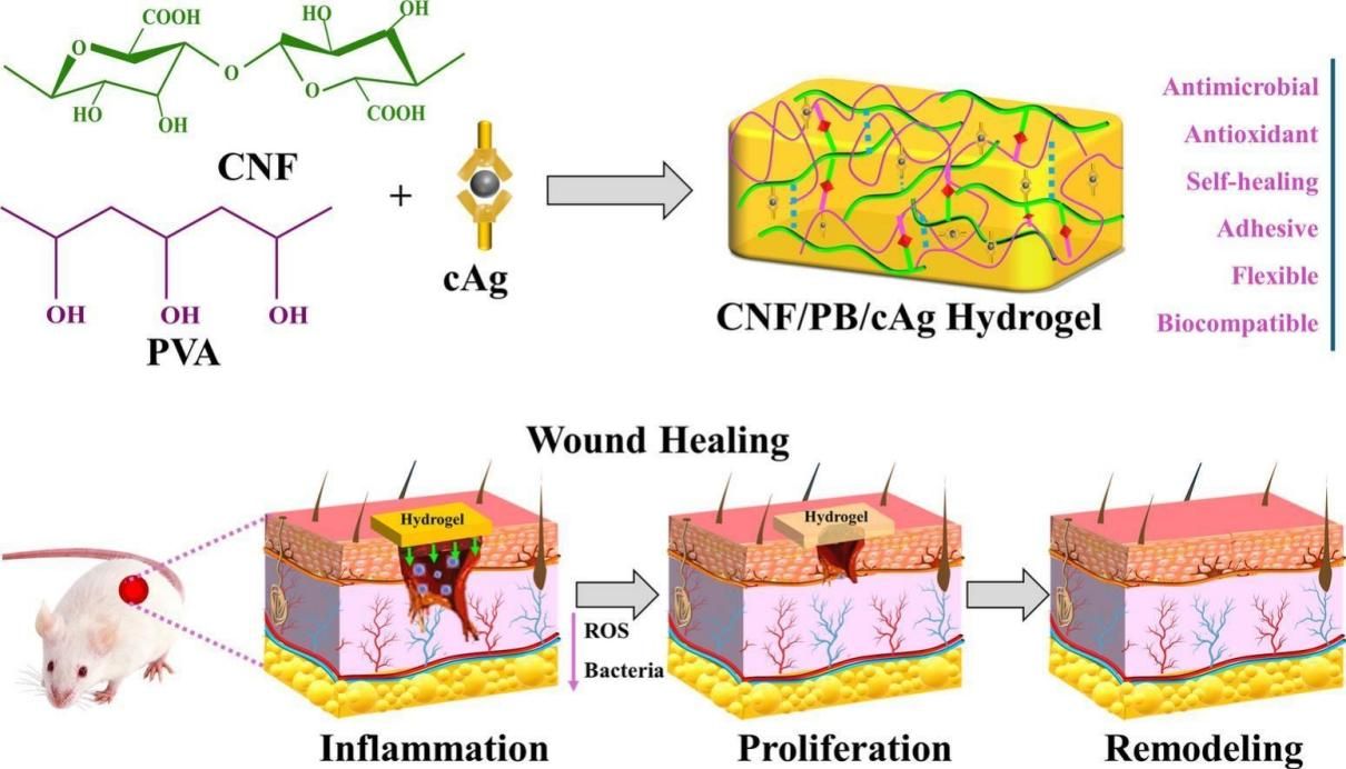 目前用于傷口愈合的傳統(tǒng)傷口敷料通常具有生物活性受限且缺乏多功能性的特點(diǎn),導(dǎo)致治療效果不佳且愈合時(shí)間延長(zhǎng)。本團(tuán)隊(duì)提出通過(guò)一步合成方法,通過(guò)交聯(lián)納米纖維素和聚乙烯醇,并利用姜黃素穩(wěn)定銀納米顆粒,形成具有動(dòng)態(tài)共價(jià)鍵和超分子結(jié)構(gòu)的水凝膠網(wǎng)絡(luò)。本設(shè)計(jì)采用天然聚合物線性結(jié)構(gòu)納米纖維素作為增強(qiáng)材料,天然抗菌和抗氧化天然多效性化合物姜黃素作為銀納米顆粒的分散劑。特別是,CNF聚合物鏈內(nèi)在組裝成獨(dú)特的納米級(jí)互穿分層結(jié)構(gòu),允許CNF與相鄰聚合物鏈之間的功能相互作用,有助于改善機(jī)械性能、自修復(fù)、柔韌性和粘合性能。有趣的是,CNFs相對(duì)反應(yīng)性表面進(jìn)一步提高了水凝膠的多功能性能。這也可以歸因于相互滲透的納米纖維素和PVA聚合物鏈之間的物理相互作用(氫鍵和鏈纏結(jié))和動(dòng)態(tài)共價(jià)化學(xué)(硼酸鹽酯鍵)的多個(gè)互連網(wǎng)絡(luò)的聯(lián)合相互作用。值得注意的是,姜黃素改性納米銀顆粒(cAg)的引入預(yù)計(jì)將通過(guò)增強(qiáng)水凝膠的生物活性在保持全部療效的同時(shí),對(duì)傷口修復(fù)發(fā)揮雙重協(xié)同治療關(guān)鍵作用。這些多方面的特征以及所提出的CNF/PB/cAg水凝膠的簡(jiǎn)單且可擴(kuò)展的制備方法表明其在臨床應(yīng)用中具有巨大的應(yīng)用潛力。相關(guān)研究成果以“Cellulose Nanofiber-reinforced Antimicrobial and Antioxidant Multifunctional Hydrogel with Self-healing, Adhesion for Enhanced Wound Healing”為題發(fā)表在國(guó)際期刊Carbohydrate Polymers(文章鏈接:https://doi.org/10.1016/j.carbpol.2024.123189)