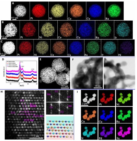 團(tuán)隊(duì)還深入探究了相關(guān)形成機(jī)制,發(fā)現(xiàn) Pt、Ru、Ir 等貴金屬元素可降低過渡金屬還原溫度,促進(jìn)單相固溶體形成,為優(yōu)化材料性能提供理論依據(jù)。同時(shí),通過調(diào)整 Pt 與 Ru 比例和還原溫度,借助原位掃描透射電子顯微鏡和密度泛函理論計(jì)算,首次實(shí)現(xiàn)同一納米顆粒中 fcc 和 hcp 相結(jié)構(gòu)的精確調(diào)控,為定制材料性能創(chuàng)造可能。