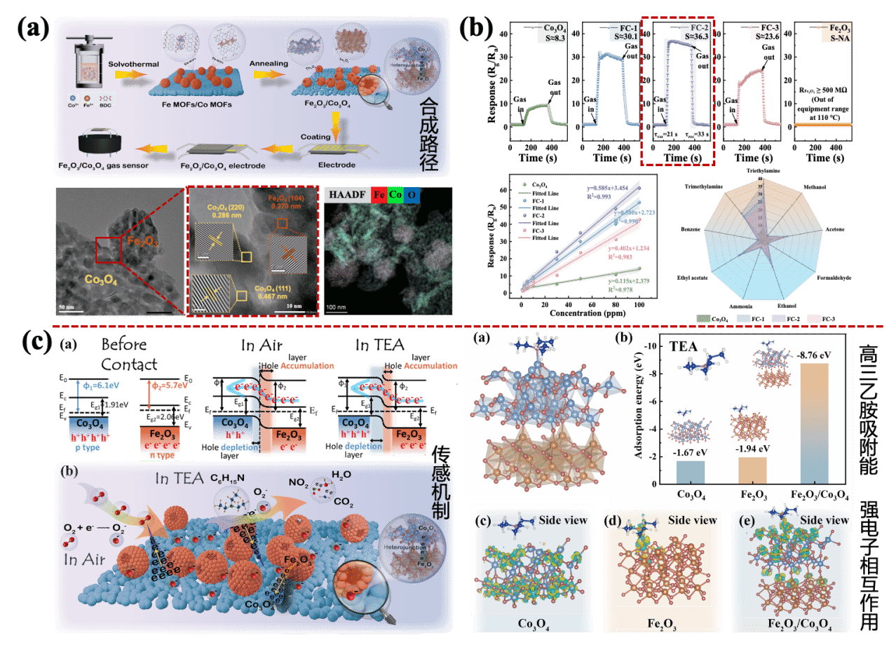 本研究聚焦“如何解決氣體傳感器在更低工作溫度下快速識別異味”這一全球關(guān)注的熱點(diǎn)難題,首次實(shí)現(xiàn)了Fe2O3納米球與Co3O4納米網(wǎng)原位構(gòu)建p-n異質(zhì)結(jié)結(jié)構(gòu),構(gòu)建出一種新型三維交聯(lián)納米復(fù)合材料。該傳感器材料能夠在比以往更低的工作溫度下(110 °C),實(shí)現(xiàn)對典型異味氣體三乙胺的高靈敏檢測,其響應(yīng)值是傳統(tǒng)材料的4倍以上,響應(yīng)/恢復(fù)時間也縮短至半分鐘以內(nèi),達(dá)到目前國際同類技術(shù)的領(lǐng)先水平。研究團(tuán)隊(duì)通過理論模擬和實(shí)驗(yàn)分析,從微觀層面揭示了材料性能提升的根本原因,發(fā)現(xiàn)Fe2O3與Co3O4在界面處原位形成穩(wěn)定的異質(zhì)結(jié),有效促進(jìn)電荷分離與遷移,提升了氣體分子的吸附效率與表面反應(yīng)活性,從而實(shí)現(xiàn)了更快速、更靈敏的信號輸出。