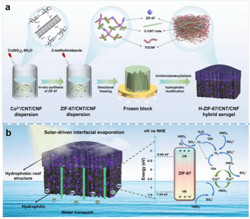 課題組研究了一種基于TEMPO氧化納米纖維氣凝膠的新型Janus太陽能蒸發(fā)器(HZC-CNF),基于垂直排列的通道和錐形屋頂?shù)莫毺亟Y(jié)構(gòu)不僅實現(xiàn)了光有效吸附和多次散射,還增強了蒸發(fā)面積和水的傳輸路徑。HZC-CNF表現(xiàn)出優(yōu)異的光熱轉(zhuǎn)換能力、良好水分蒸發(fā)率(1.97 kg m-2 h-1)和對包括環(huán)丙沙星在內(nèi)的各種污染物(>90 %)的去除效率,可實現(xiàn)光熱水蒸發(fā)和污染物降解的協(xié)同作用。相關(guān)研究成果以“Janus structured cellulose-based aerogel with vertical channels and conical roof for efficient solar-driven water evaporation and pollutant degradation”為題發(fā)表在《Carbohydrate Polymers》上。23級博士生田國棟為本文第一作者,段超教授和王建教授為通訊作者。