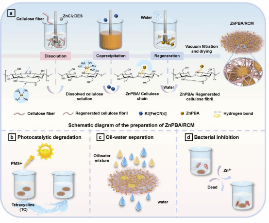 課題組研究提出了一種簡單易行的“一石二鳥”策略,構(gòu)建了普魯士藍類似物(ZnPBA)微球修飾的多功能再生纖維素復合膜,用于廢水凈化。ZnPBA/RCM具有較高的ZnPBA負載量(65.3wt%)、良好的光催化降解四環(huán)素(TC)(去除率為90.3%,礦化率為54.3%)、油水分離效率(對不同種類的油均>97.8%)和抗菌性能。相關(guān)研究成果以“A one-stone-two-birds strategy for cellulose dissolution, regeneration, and functionalization as a photocatalytic composite membrane for wastewater purification”為題發(fā)表在《International Journal of Biological Macromolecules》上。22級碩士生劉笑霜為本文主要完成人,段超教授為第一和通訊作者。
