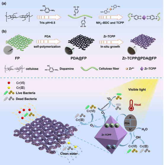 課題組研究制備了一種纖維素紙基復合膜(Zr-TCPP@PDA@FP),用于Cr(VI)的光還原和光熱抗菌。Zr-TCPP@PDA@FP對Cr(VI)表現(xiàn)出明顯的光催化還原作用,在20min內(nèi)去除率達到93.9%,且具有良好的循環(huán)穩(wěn)定性。此外,雜化膜還具有良好的光熱抗菌性能。相關(guān)研究成果以“Mussel-inspired polydopamine and Zr-porphyrin MOF co-decoration of a cellulose paper-based composite membrane for efficient photoreduction of Cr(VI) and photothermal antibacterial in wastewater”為題發(fā)表在《Separation and Purification Technology》上。22級碩士研究生車莎莎為本文主要完成人,段超教授為第一和通訊作者。