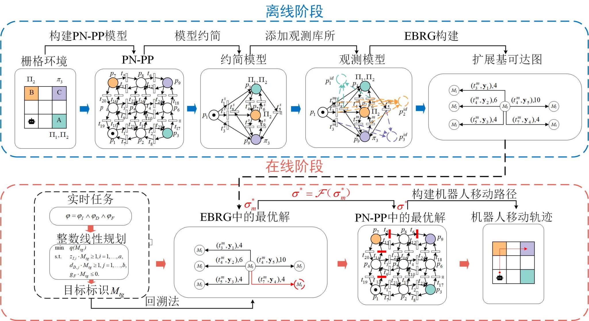 針對(duì)上述難點(diǎn),本研究團(tuán)隊(duì)提出了一種基于Petri網(wǎng)的多機(jī)器人系統(tǒng)最優(yōu)路徑規(guī)劃方法。通過(guò)將多機(jī)器人系統(tǒng)抽象為圖形化的Petri網(wǎng)模型,并設(shè)計(jì)結(jié)構(gòu)控制器,實(shí)現(xiàn)復(fù)雜任務(wù)約束的形式化表征。為避免機(jī)器人數(shù)量增加而引發(fā)狀態(tài)爆炸問(wèn)題,提出一種狀態(tài)空間壓縮方法和高效的實(shí)時(shí)在線規(guī)劃算法,實(shí)現(xiàn)多機(jī)器人復(fù)雜任務(wù)的實(shí)時(shí)分配和最優(yōu)路徑規(guī)劃。理論分析與數(shù)值實(shí)驗(yàn)均表明,該方法在保證規(guī)劃最優(yōu)性的同時(shí),顯著提升了計(jì)算效率和可擴(kuò)展性,尤其在機(jī)器人數(shù)量和環(huán)境規(guī)模不斷增加的情況下,表現(xiàn)出優(yōu)于現(xiàn)有方法的性能。