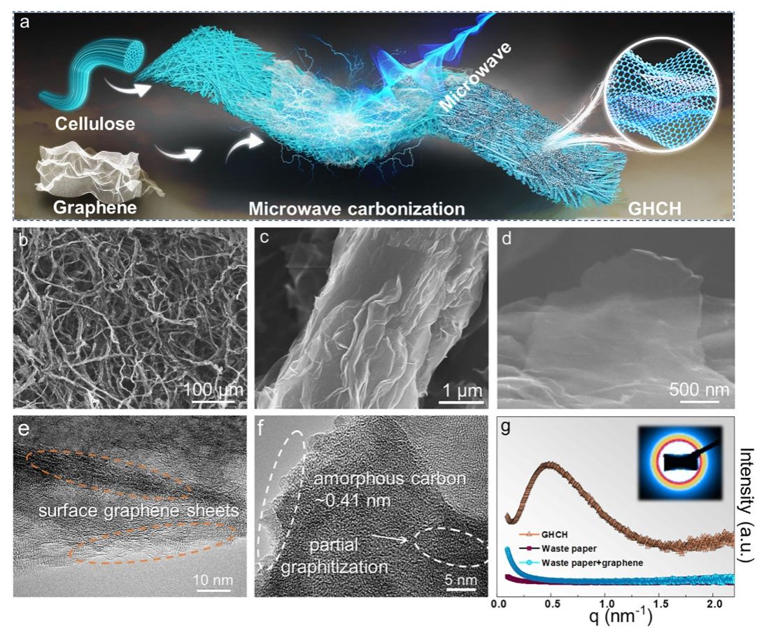 傳統(tǒng)碳化法制備碳材料面臨能耗高、效率低的瓶頸。本研究采用微波碳化技術(shù),利用石墨烯微反應(yīng)器,在短短 10 秒內(nèi)快速碳化廢紙,制備出一種由石墨烯與硬碳構(gòu)成的異質(zhì)結(jié)構(gòu)碳質(zhì)電極。通過結(jié)合實(shí)驗(yàn)證據(jù)與有限元模擬,證實(shí)了一種新穎的微波碳化機(jī)理:石墨烯吸收微波產(chǎn)生高頻等離子體電磁波,該電磁波“催化”樣品快速吸收微波,導(dǎo)致樣品內(nèi)部發(fā)生電擊穿從而引發(fā)初步碳化。利用這種超快碳化技術(shù)制備的碳質(zhì)材料作為鉀離子電池負(fù)極,展現(xiàn)出高可逆容量和優(yōu)異的循環(huán)穩(wěn)定性??傊?,微波碳化為合成高性能碳基電極提供了一條可持續(xù)且高效的途徑。https://doi.org/10.1002/adfm.202508032