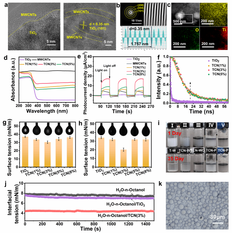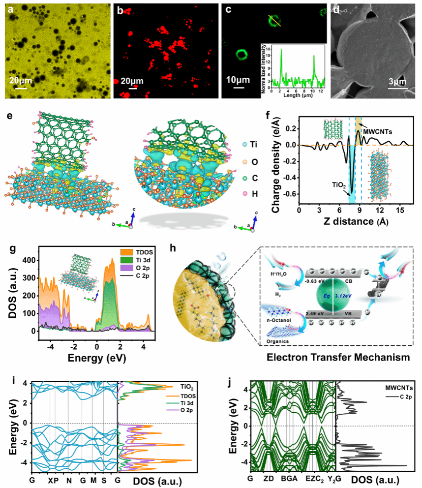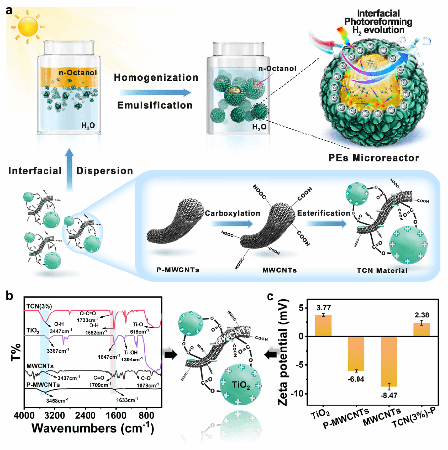 為了突破上述問題,本研究開發(fā)出由TiO2/MWCNTs穩(wěn)定的Pickering乳液體系,用于界面光催化重整產(chǎn)氫。該體系顯著改善了基底材料間的結(jié)合性、乳液穩(wěn)定性及活性物種傳輸效率。TiO2與MWCNTs通過靜電吸引和酯化作用相結(jié)合,有效抑制了反應(yīng)過程中基底粒子的脫落;通過優(yōu)化條件,在降低界面張力的同時保障了乳液的穩(wěn)定性;光生電子可有效地從TiO2定向轉(zhuǎn)移至MWCNTs,確保了光生載流子的有效分離。與油-水單相及混合相體系相比,該Pickering乳液的光催化重整產(chǎn)氫效率顯著提升。該研究為強化液-液非均相體系光催化重整反應(yīng)提供了新思路。