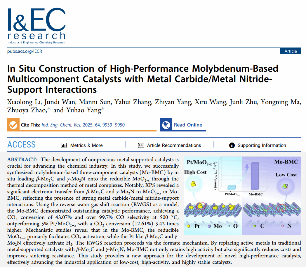 團隊采用金屬絡(luò)合物原位熱分解法,在可還原載體MoO???上原位生成β-Mo?C與γ-Mo?N,成功構(gòu)建出具有類貴金屬特性的鉬基三組分催化劑—Mo-BMC。以逆水煤氣變換反應(yīng)(RWGS)為模型反應(yīng),Mo-BMC在500 °C下實現(xiàn)CO?轉(zhuǎn)化率43.07%、CO選擇性超99.7%,性能為同條件下5%Pt/MoO???的3.42倍。機理研究標(biāo)明MoO???是CO?的活性中心,而β-Mo?C和γ-Mo?N是H?的活性中心,反應(yīng)經(jīng)甲酸鹽路徑進(jìn)行。該策略以非貴金屬替代傳統(tǒng)金屬活性中心,展示了以類貴金屬化合物替代傳統(tǒng)貴金屬的有效途徑,在保證催化性能的同時降低催化劑成本、提高抗燒結(jié)穩(wěn)定性方面具有顯著優(yōu)勢。研究成果以題為 “In Situ Construction of High-Performance Molybdenum-Based Multicomponent Catalysts with Metal Carbide/Metal Nitride-Support Interactions” 發(fā)表在《Industrial & Engineering Chemistry Research》。該工作主要由2022級碩士研究生萬俊弟完成。https://doi.org/10.1021/acs.iecr.5c00319