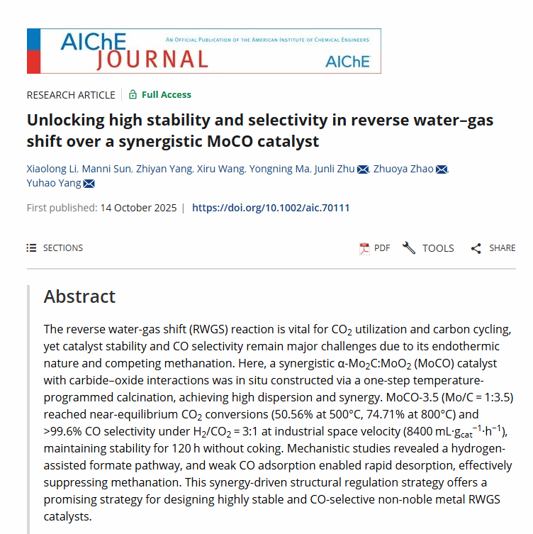 團隊通過一步控溫焙燒法原位構(gòu)建碳化物–氧化物協(xié)同體系(α-Mo?C:MoO?),形成高分散MoCO復(fù)合界面。MoCO-3.5在CO?/H? = 1:3條件下,于800 °C實現(xiàn)74.71% CO?轉(zhuǎn)化率和超過99.6%的CO選擇性,在工業(yè)級反應(yīng)空速下具有優(yōu)異穩(wěn)定性且無積碳生成。機理研究表明該催化劑遵循氫輔助的甲酸鹽反應(yīng)機理。CO的快速脫附有效抑制了CO在催化劑表面被深度加氫生成甲烷。該成果為開發(fā)高穩(wěn)定、高選擇性、非貴金屬催化劑提供了新思路。研究以“Unlocking high stability and selectivity in reverse water-gas shift over a synergistic MoCO catalyst”為題發(fā)表在《AIChE Journal》。實驗工作主要由2023級碩士研究生孫曼妮完成。https://doi.org/10.1002/aic.70111