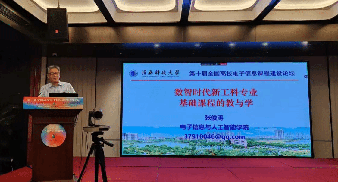 4月19日,第10屆全國高校電子信息課程建設(shè)論壇在杭州召開,我校電子信息與人工智能學院張俊濤教授受邀在論壇上以“數(shù)智時代新工程專業(yè)基礎(chǔ)課程的教與學”為主題做了專題報告,報告引起參會教師的共鳴,受到一致好評。