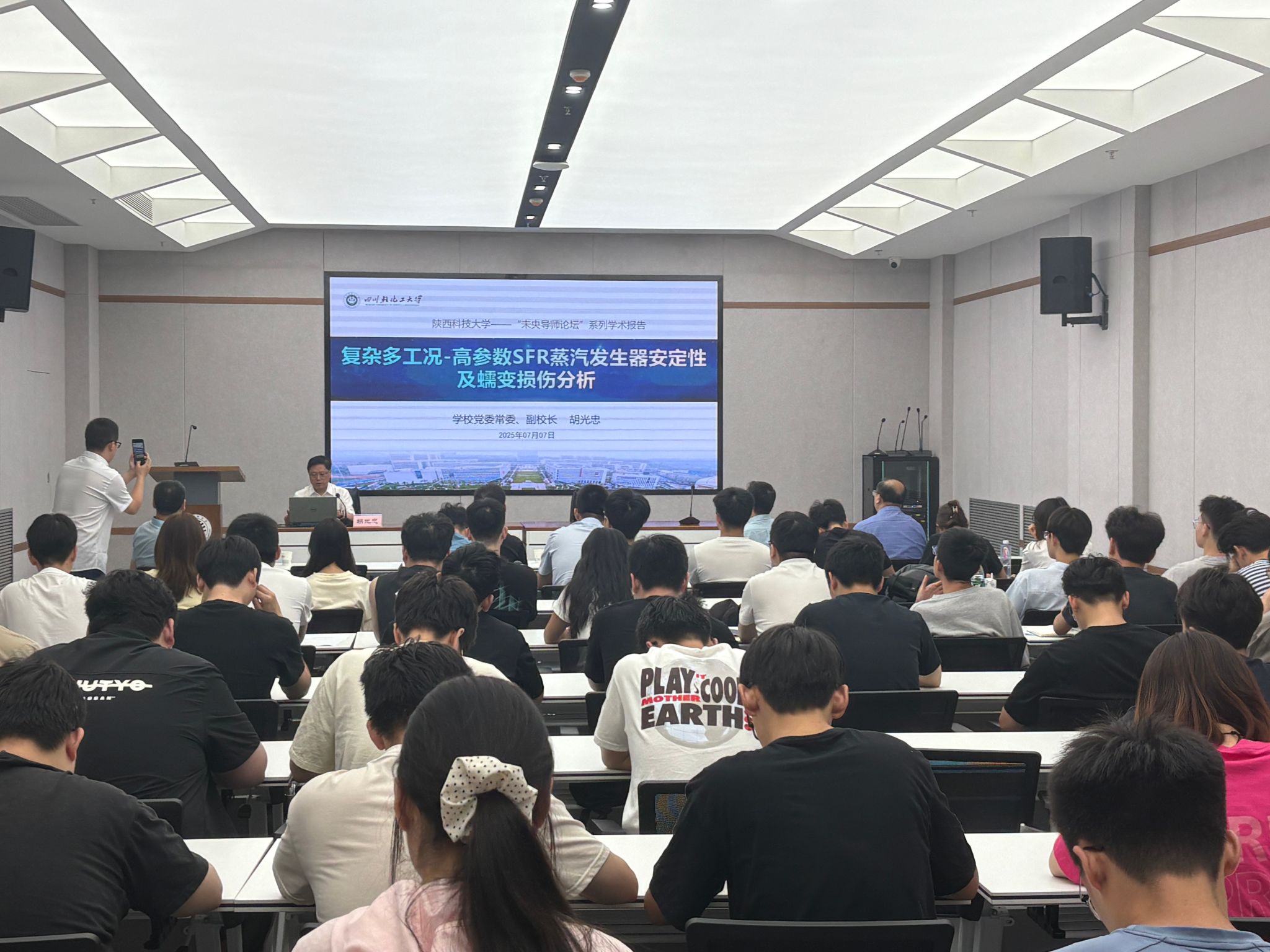 7月7日,應研究生院和機電工程學院(智能制造與機器人工程學院)邀請,四川輕化工大學副校長胡光忠教授做客我?!拔囱雽熣搲保髁祟}為“復雜多工況-高參數(shù)SFR蒸汽發(fā)生器安定性及蠕變損傷分析”的學術報告,報告會由研究生院院長強濤濤教授主持,機電學院院長楊立軍、副院長袁越錦及學院相關專業(yè)教師和研究生參加了本次報告會。
