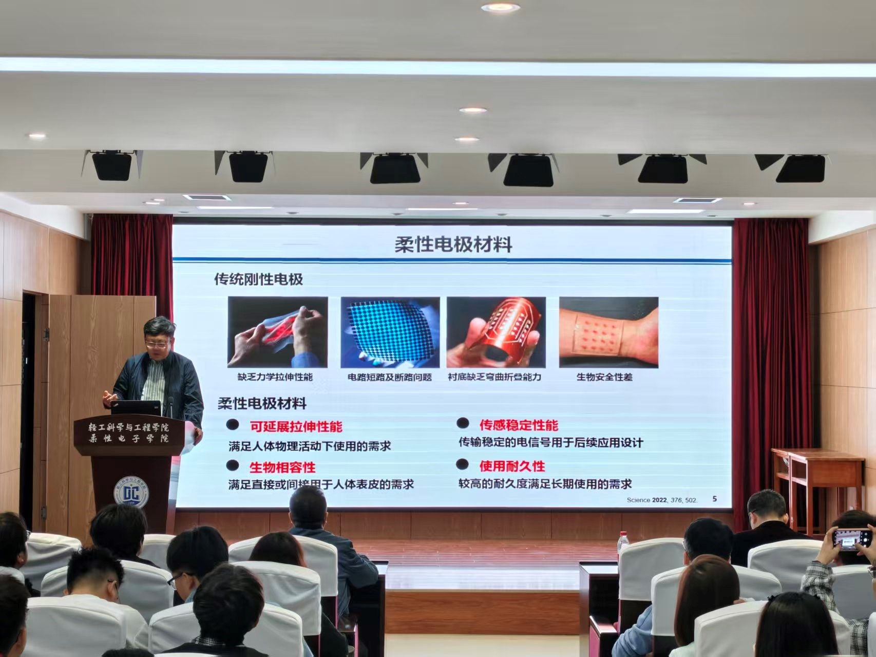 9月29日上午,應(yīng)我校科技處、前沿院及輕工科學(xué)與工程學(xué)院(柔性電子學(xué)院)邀請(qǐng),西北工業(yè)大學(xué)柔性電子研究院李鵬教授做客我?!扒把乜茖W(xué)報(bào)告”,作了題為“柔性人機(jī)交互界面與診療器件”的學(xué)術(shù)報(bào)告。報(bào)告會(huì)由輕工科學(xué)與工程學(xué)院(柔性電子學(xué)院)副院長(zhǎng)劉國(guó)棟主持,學(xué)院相關(guān)專業(yè)教師、研究生及部分本科生參加了此次報(bào)告會(huì)。