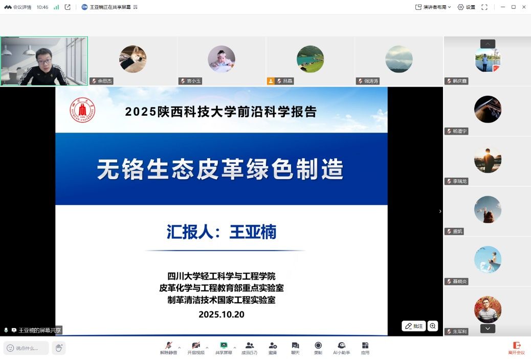 10月21日上午,應(yīng)科技處、前沿院及輕工科學(xué)與工程學(xué)院邀請(qǐng),中國林業(yè)科學(xué)研究院王奎研究員、四川大學(xué)王亞楠教授做客我?!扒把乜茖W(xué)報(bào)告”,并分別做題為“生物基呋喃化學(xué)品低碳高效轉(zhuǎn)化”、“無鉻生態(tài)皮革綠色制造”的線上學(xué)術(shù)報(bào)告。輕工學(xué)院相關(guān)專業(yè)教師、研究生參加報(bào)告會(huì)。