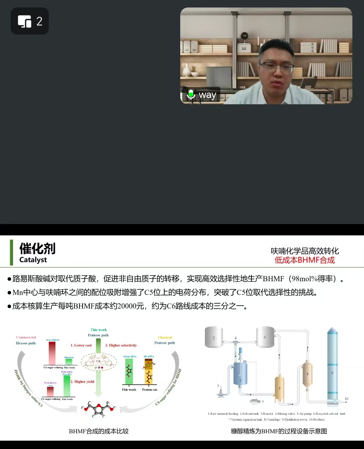 王奎研究員在生物基呋喃化學(xué)品低碳高效轉(zhuǎn)化領(lǐng)域的研究報(bào)告中先介紹了生物基呋喃化學(xué)品低碳高效轉(zhuǎn)化領(lǐng)域的相關(guān)技術(shù)背景,詳細(xì)介紹了陰離子效應(yīng)對(duì)葡萄糖轉(zhuǎn)化為5-羥甲基糠醛(HMF)的調(diào)控機(jī)制,通過電子張力效應(yīng)加速糖類定向轉(zhuǎn)化,為均相催化劑篩選提供理論依據(jù)。進(jìn)一步,王奎研究員詳細(xì)介紹了其團(tuán)隊(duì)在創(chuàng)制液態(tài)糧食(單糖、低聚糖)、呋喃基聚酯(PEF)、聚酰胺等功能材料的?高值化產(chǎn)品開發(fā)方面所開展的一些工作,推動(dòng)了生物基材料在能源和化工領(lǐng)域的應(yīng)用?。最后,王奎研究員談及了其課題組在?產(chǎn)業(yè)化與示范方面所開展的一些工作。王奎研究員的學(xué)術(shù)報(bào)告展示了他在呋喃基材料在功能化應(yīng)用方面的研究進(jìn)展,對(duì)大家今后研究方向的拓展有很好的啟發(fā)性。