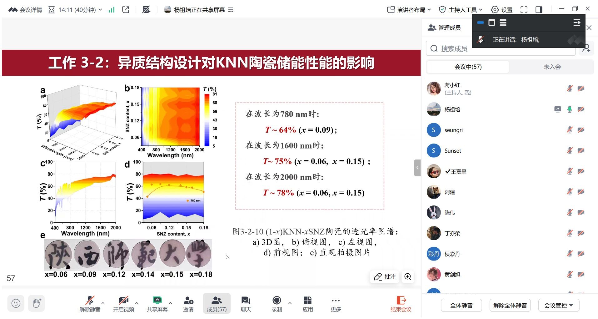 楊祖培教授的報(bào)告內(nèi)容豐富翔實(shí),邏輯清晰明了,使此次聆聽報(bào)告的師生對無鉛鐵電陶瓷儲能性能優(yōu)化有了深入的了解,對我校師生在相關(guān)領(lǐng)域科研工作的深入開展也具有很好的啟發(fā)性和指導(dǎo)性。報(bào)告會后,楊祖培教授與師生們展開了深入的交流討論,專業(yè)地解答了參會師生們提出的各類問題,并誠摯的邀請與會師生在今后科研工作中多合作、多溝通。
